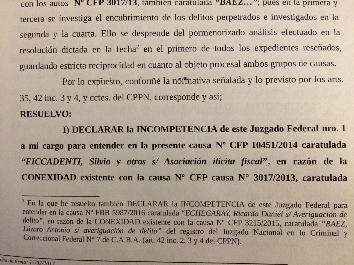 Para el juez Casanello, los hechos que se investigan en Bahía Blanca y que involucran a los grupos empresarios bahienses Ficcadenti, Ferreyra y Pedraza constituyen el delito precedente, requisito indispensable para avanzar en su acusación y procesamiento contra Báez, su hijo Martín y otras personas más, por la acusación de lavado de dinero. Sostiene López Da Silva que ambas pesquisas «se superponen y resultan conexas, pues el hecho investigado –el lavado de dinero ilícito obtenido de los delitos tributarios reseñados y también de la sobrefacturación de la obra pública- resulta el mismo«. Agrega el juez en la resolución tomada este viernes que en este caso «corresponde priorizar la jurisdicción de quién ha prevenido (en referencia a Casanello) puesto esto es lo que aconseja, además, la mejor y más pronta administración de justicia«.
