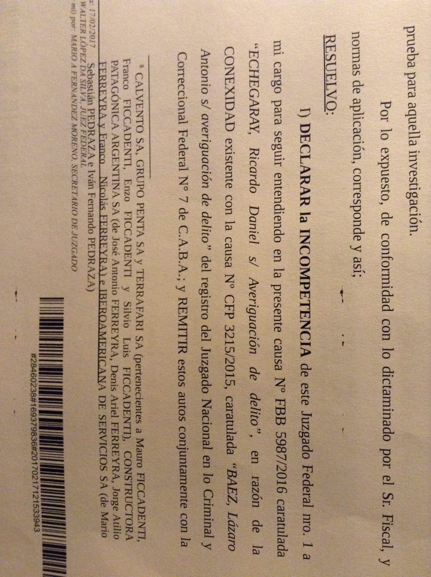 Tras citar las pruebas aportadas y la declaración tomada al periodista del diario La Nación Hugo Alconada Mon, cuyas publicaciones dieron inicio a la causa 10451/2014 en la que López Da Silva se declaró incompetente, el juez concluye que su trabajo y el de Casanello se superponen, por lo que decide girarle el expediente. No obstante, sostiene que «más allá de la falta de verificación de la entrega de «un sobre» por parte del abogado Leonardo Gómez Talamoni al entonces Administrador Federal de Ingresos Públicos, lo cierto es que los elementos colectados en pos de verificar esas circunstancias, no han hecho más que sumar elementos atados a la hipótesis investigativa que se sigue en la causa 3215/2015 en la que se investigan las complicidades de los funcionarios de AFIP para obstruir el avance de fiscalizaciones que avanzaban inexorablemente hacia las empresas del grupo Báez» cita López Da Silva a Casanello. Más adelante concluye: «para evitar que se descubriera la millonaria estafa tributaria que protagonizaba Austral Construcciones, perteneciente al empresario Lázaro Báez -vinculado a funcionarios del otrora gobierno nacional- desde la AFIP se resolvió entorpecer las investigaciones propias del organismo, ocultando ese designio poniendo el foco en las empresas que le habían suministrado facturación apócrifa a esa firma, en la inteligencia de que regularizando sus situaciones, podría justificarse la contabilidad tributaria de Austral; así es como entran en escena, Constructora Patagónica Argentina S.A., Calvento S.A. y Grupo Penta y Cía S.A. (y también Iberoamericana de Servicios)«.