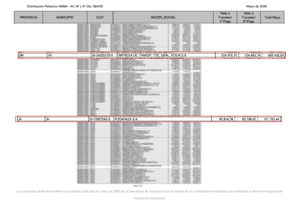 En ese contexto, la Secretaría de Transporte distribuyó subsidios para Teniente General Roca y Rocaraza, las empresas manejadas por Milei, por al menos US$ 33 millones (a los tipos de cambio entonces vigentes) entre 2005 y mediados de 2007. La cifra se desprende de cientos de planillas PDF que esa dependencia publicaba mes a mes en su página web con el monto detallado de ayudas por empresa y que fueron revisadas para esta investigación. La ayuda del Estado fue clave para que Norberto Milei consolidara su fortuna.