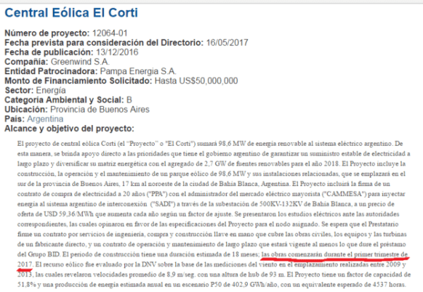 El próximo 16 de mayo, el directorio de la Corporación Interamericana de Inversiones, va a considerar un pedido de financiamiento para instalar una central eólica en Bahía Blanca. Se denomina El Corti y la solicitud es de hasta 50 millones de dólares. La peticionante es la firma Greenwind, patrocinada por Pampa Energía S.A. En los... Leer más →